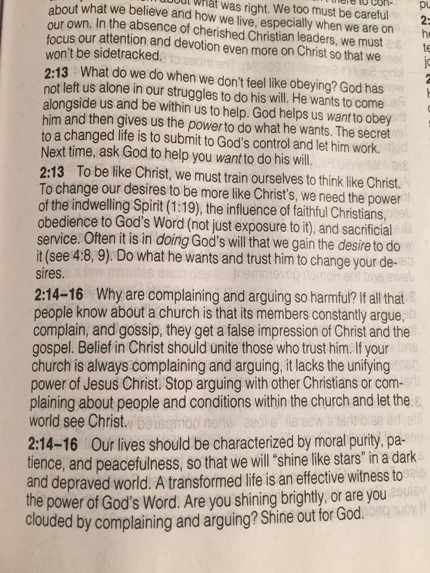 As I read the study notes for Philippians 2:14-16, I smiled at the wisdom of my own child. The words were true and the spirit was not, indeed.