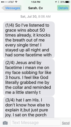 Grace Wins is also a song I was compelled to share with a sweet friend a few weeks ago. Long story short, I witnessed to the love of Jesus in our shop months ago and she went to her car and cried to the same God she had not prayed to in quite some time. We have had many Godversations and it’s thrilling to see Him transform her life.