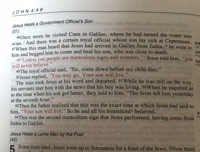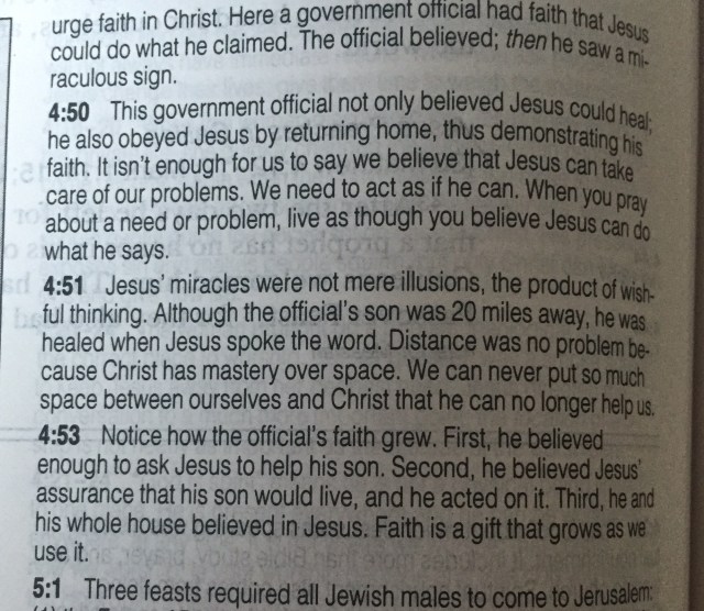Noon. I just learned the 7th hour was between noon and one in the afternoon. So, Based on where He had me flip my Bible open today, Jesus cured the government official’s son at Noon, twenty miles away.