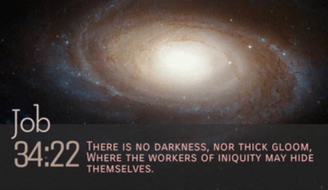 There is no dark place On February 20, 2017 By mygodroomIn Uncategorized …no deep shadow where evil doers can hide. Thank you, God, for clear direction in Job 34:22 this morning. No doubt, with everything else going on, it was our perfect flip to start the week. Share this: Click to share on X (Opens in new window) X Click to share on Facebook (Opens in new window) Facebook Like Loading... Related