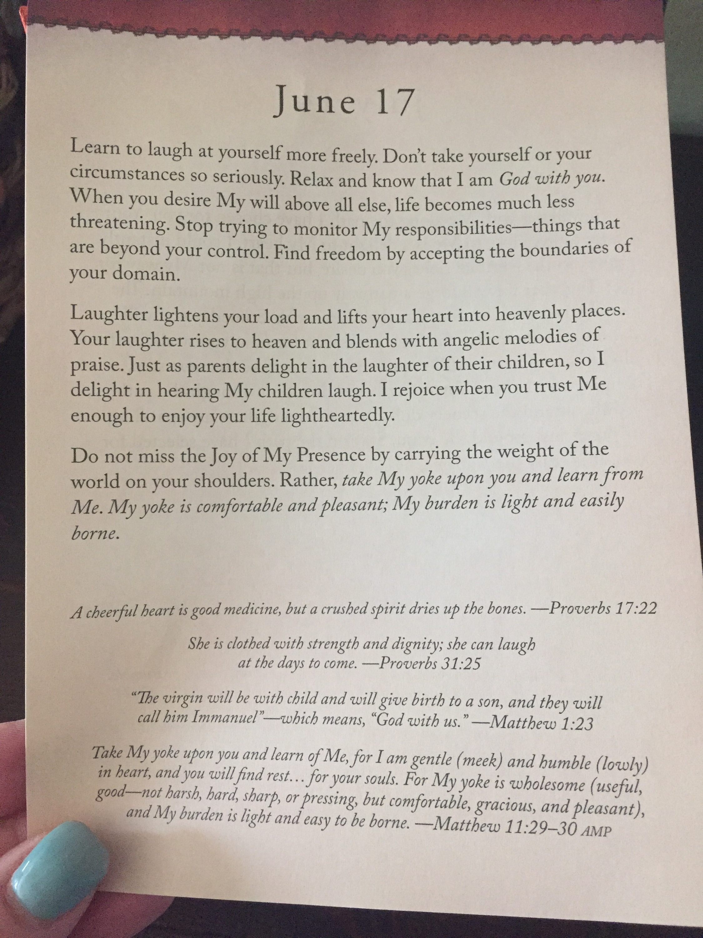 Perfect as Mark as been gone 9 days and I have five more nights without him. I love you, Lord. Thank you for this reminder. On June 17, 2017 By mygodroomIn Uncategorized Share this: Click to share on X (Opens in new window) X Click to share on Facebook (Opens in new window) Facebook Like Loading... Related
