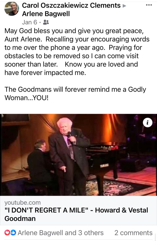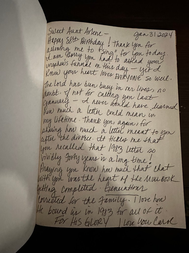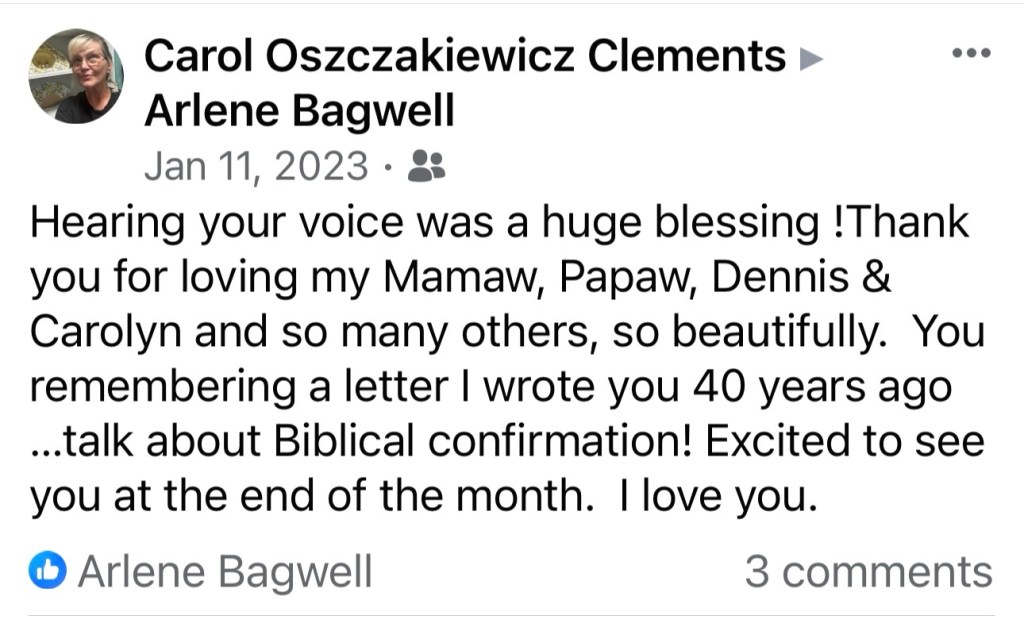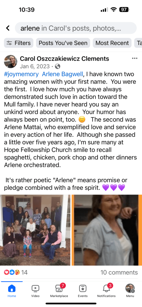 Arlene told me she could never forget me. I asked her why. Her response humbled me to the core. “Carol, when W.T. left me in 82-83, you sent me the most beautiful letter.” She told me how much it made her feel loved when her world was falling apart. I sent her a letter telling her that NO MATTER WHAT, I loved her and she would always be my Aunt Arlene. Simple, really.