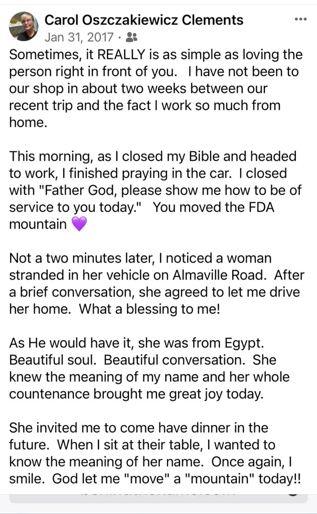 Of particular note to me was realizing the language I was led to use posting about meeting Mervat in January 2017. I wrote “ You moved the FDA mountain.