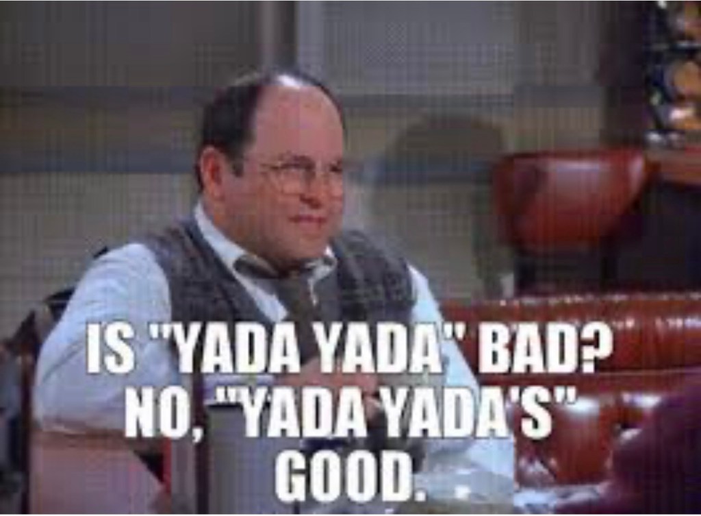 I am embracing what I see as Divine Humor on the “yada yada”. My Savior says eternal life depends on a Yada relationship with God PLUS a yada relationship with Jesus/Yeshua. Yada yada, hallelujah! 🤣🤣🤣