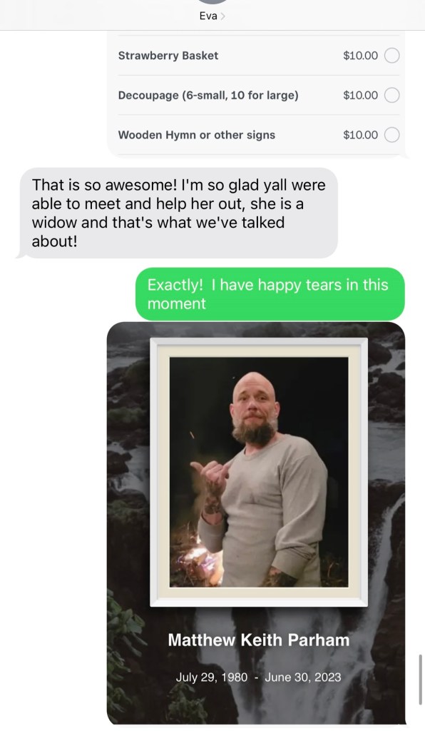Eva texted something about our hearts for widows and orphans. I am certain we touched on the “widows and orphans theme”, last night, Linda. Eva and I have gone deep diving into the topic together. You are the first “technically a widow” person to have products in our shop. The Holy Spirit loves to teach me things through His People and I’ve learned a ton from you both already! Thank you, both.
