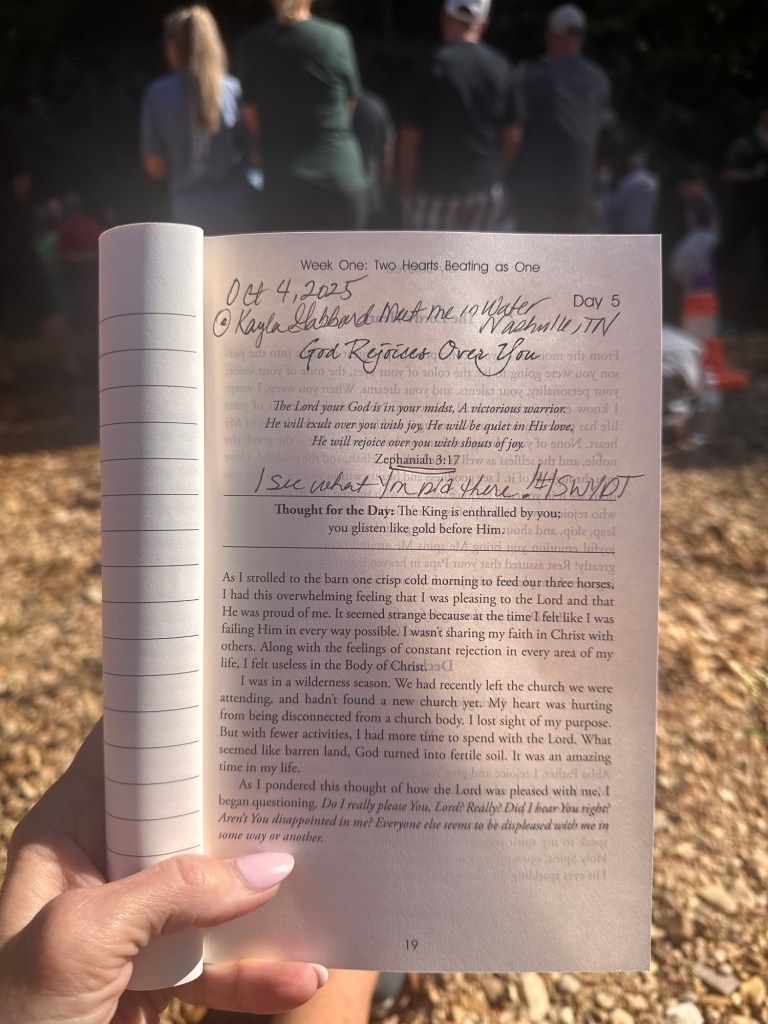 No shocker, today was “Day Five” in that new devotional. When I opened to the fifth day and saw Zephaniah 3:17, it was confirmation to be still and listen to His Melody. Being here with some of His Children for nearly five hours has been a bigger blessing than words can describe. Zeph 3:17 was given to me in August and they way it keeps popping up in various places is sich a huge Godwink for me.