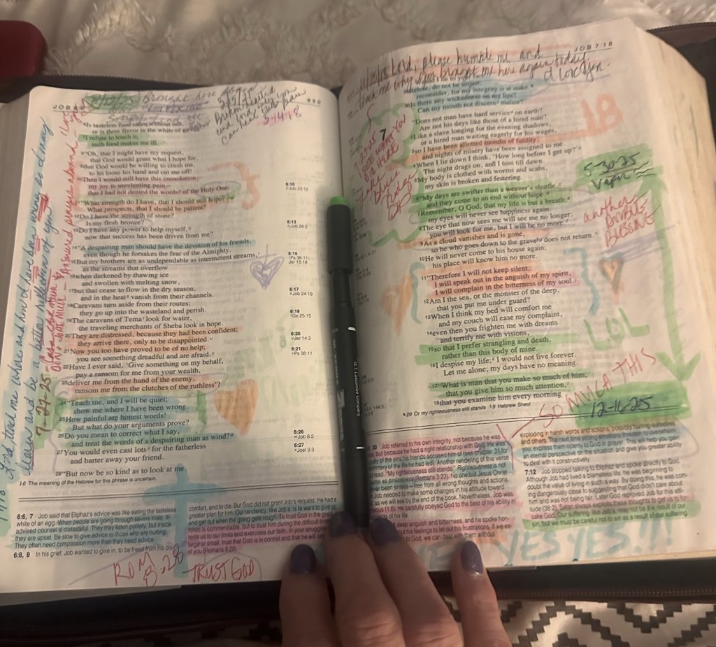He had me wrote those notes SEVEN years ago for His good purpose. Not shocking to me was to see the red marker used on 7/27/25 —- the same day I made a Romans 8:28 note. Maybe it’s only funny if you know my habit of enlarging font when He makes a point. Romans 8:28 is actually in the study notes. For me to “write it down” larger is an inside joke, so to speak.