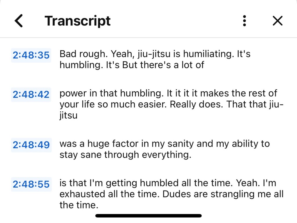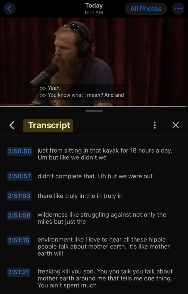 Around 5 am, the Holy Spirit was nudging me back to Joe Rogan Episode #2358. “What did he actually say—-check the transcript”. Sometime during the last two weeks, I know I had already done this. So, I searched my photos for the screenshot “receipts”.